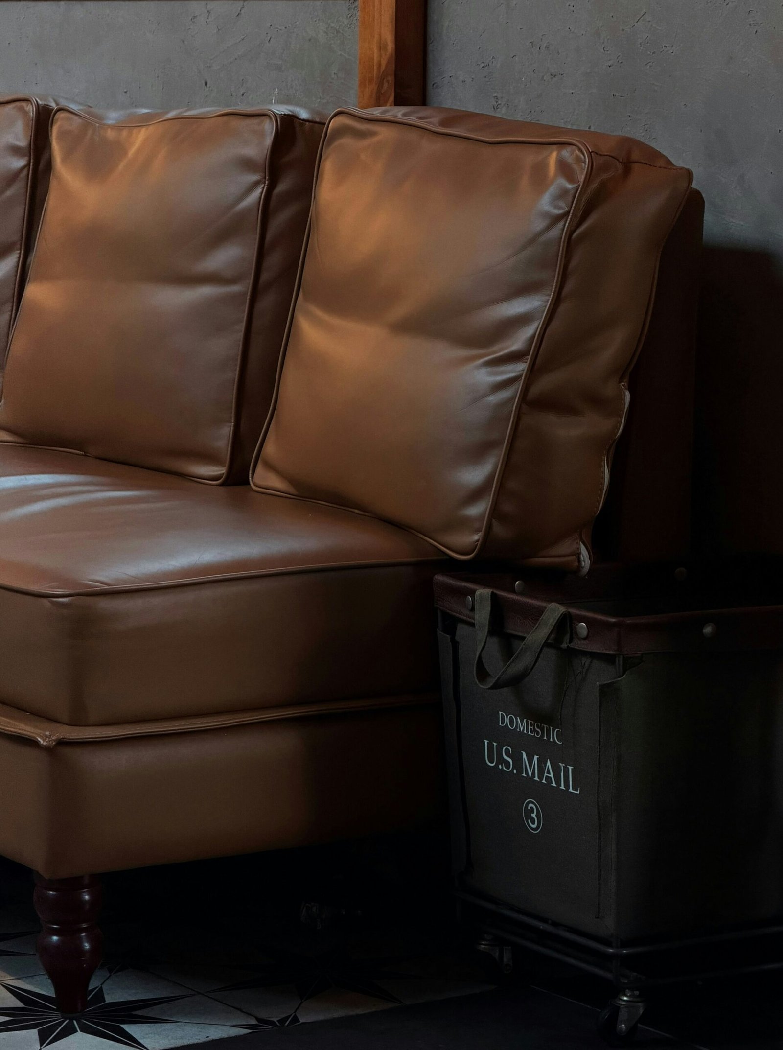A timeless leather sofa in rich cognac brown with traditional turned wooden legs and plush cushioning that ages beautifully over time, bringing warmth and classic elegance to living rooms with an industrial or traditional style.