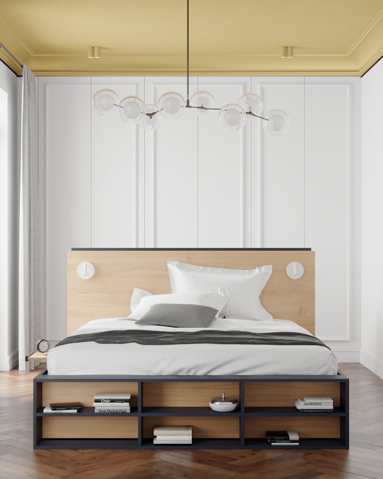 A masterclass in Scandinavian utility, this dual-tone platform bed combines a charcoal frame with natural oak accents. Designed for modern living, it features integrated footboard shelving for smart storage and an expansive headboard with built-in ambient lighting, creating a sleek, minimalist sanctuary.